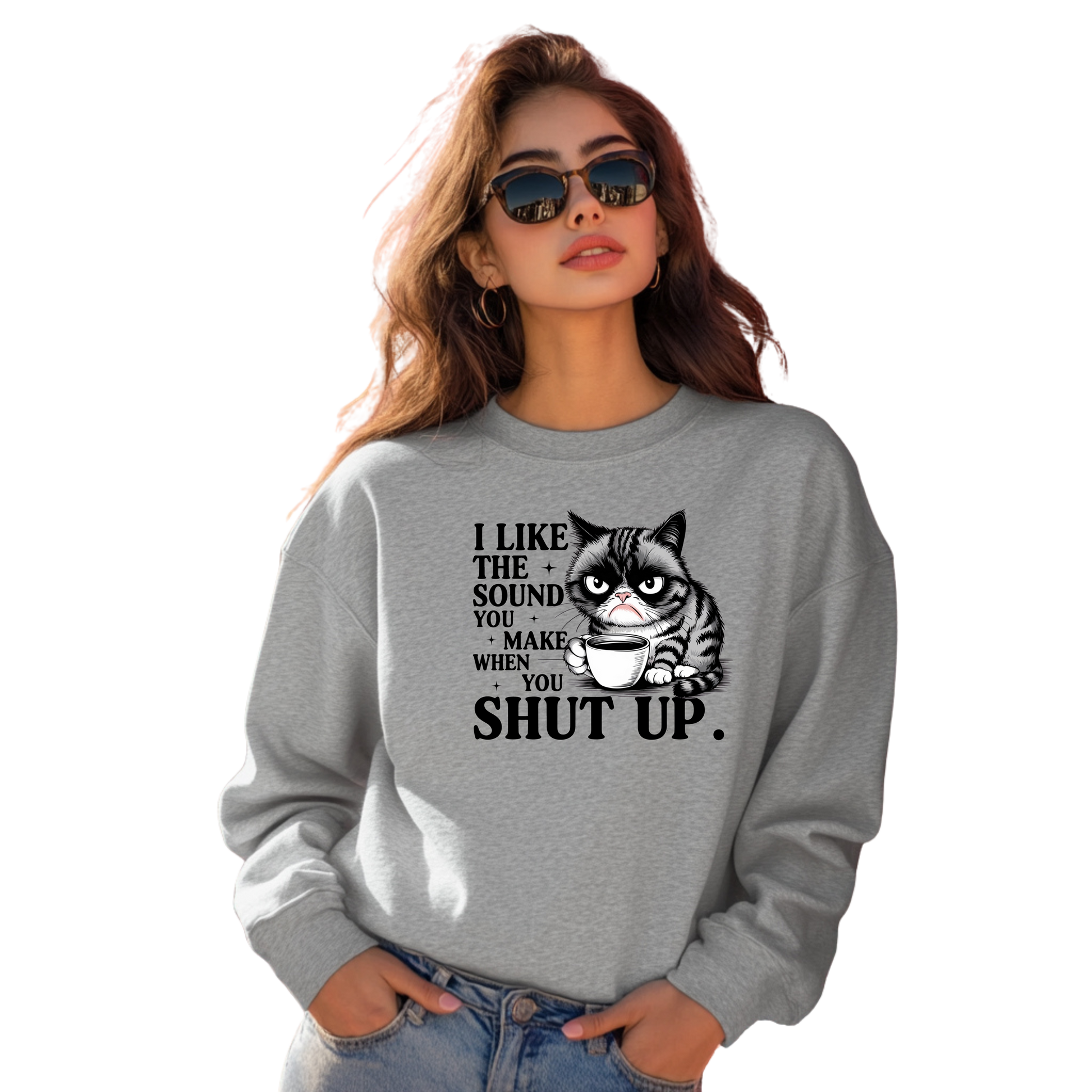 This is Grumpy Catitude Shut Up Coffee Crewneck Pullover Sweatshirt. T o Complete The look! purchase Grumpy Catitude Funny I Like the Sound You Make When You Shut Up Funny Cat Mug. Click Here: I Want The Matching.