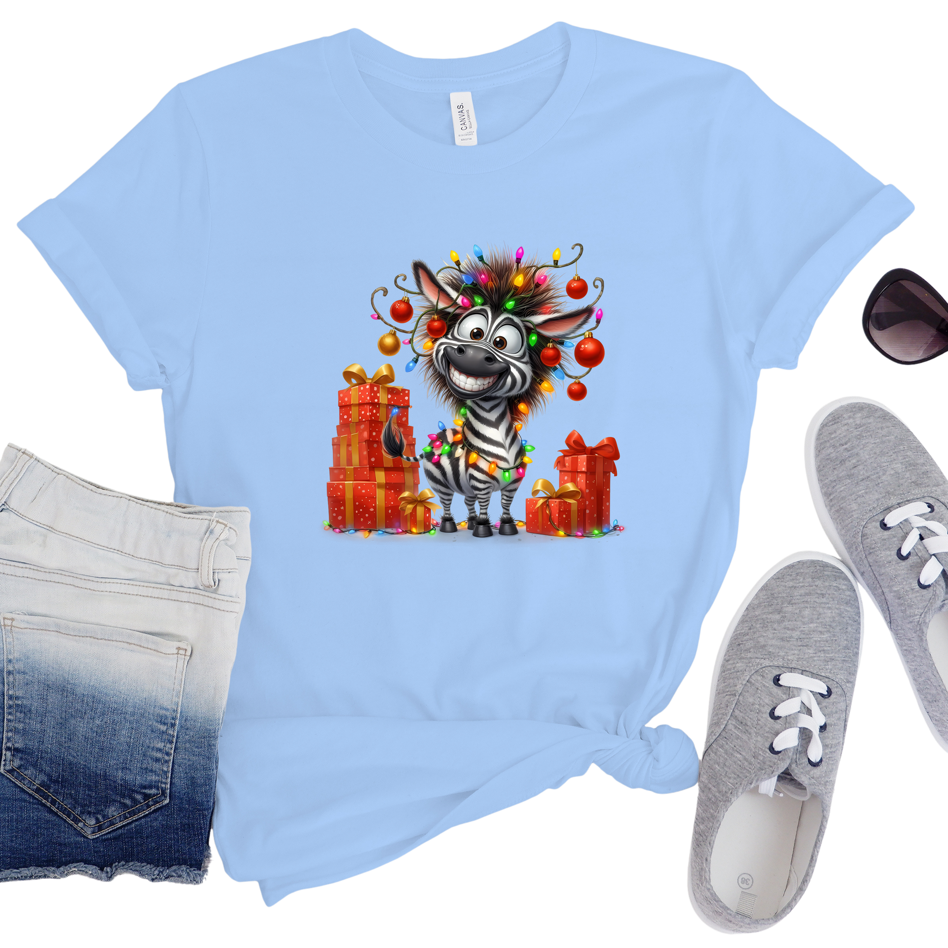 Deck the stripes and jingle all the way with our Zebra in the Lights Christmas Tee.🎄🦓This hilariously cute design features a wild-eyed zebra tangled in vibrant holiday lights and ornaments, standing proudly among stacks of festive gifts. With its wild mane full of cheer and bright expression, this zebra is ready to light up your holidays literally! Whether you’re heading to a holiday party, snapping pics with the fam, or shopping for a one-of-a-kind gift, this tee adds joy and color to every occasion.