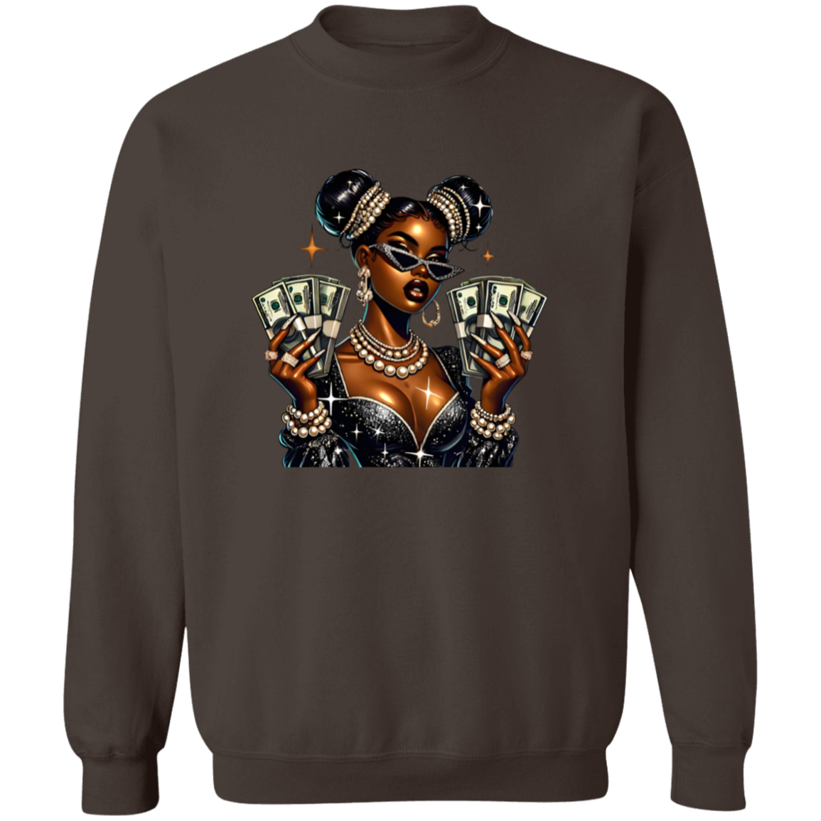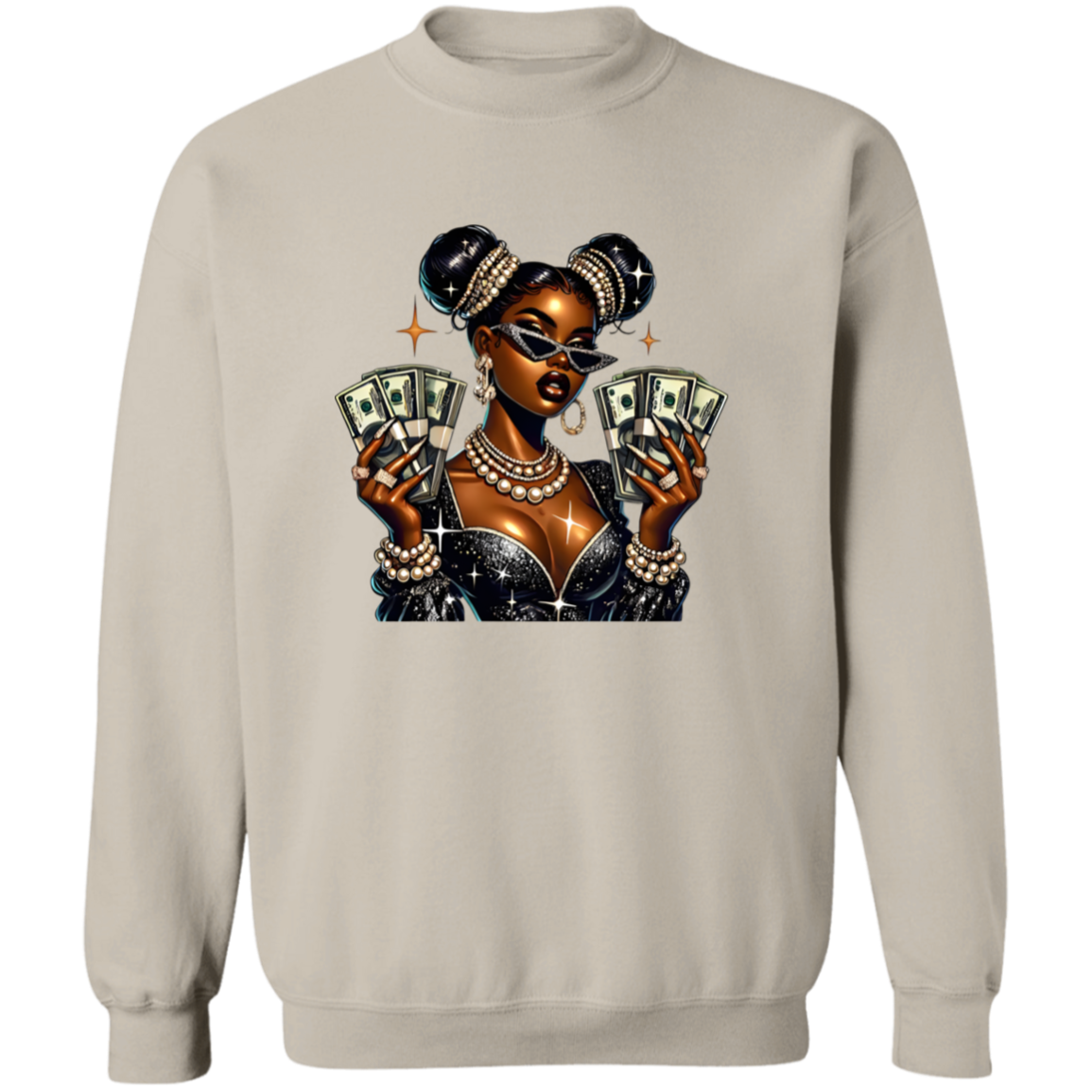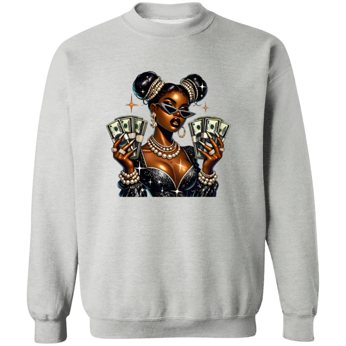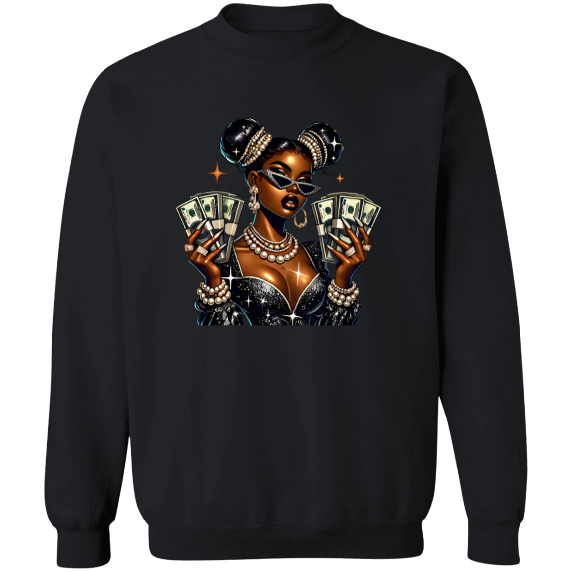 Elevate your style with the Money Moves Boss Babe Graphic Crewneck Pullover Sweatshirt. Showcasing a confident, melanin-rich queen adorned with pearls, diamonds, and bold sunglasses while holding stacks of cash, this sweatshirt embodies wealth, empowerment, and self-assurance. Ideal for entrepreneurs, go-getters, and those who recognize their value, it delivers a powerful message without words. Whether at a meeting, social event, or out on the town, this piece exudes unstoppable ambition and success.