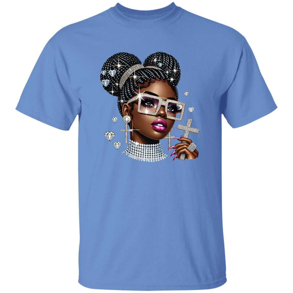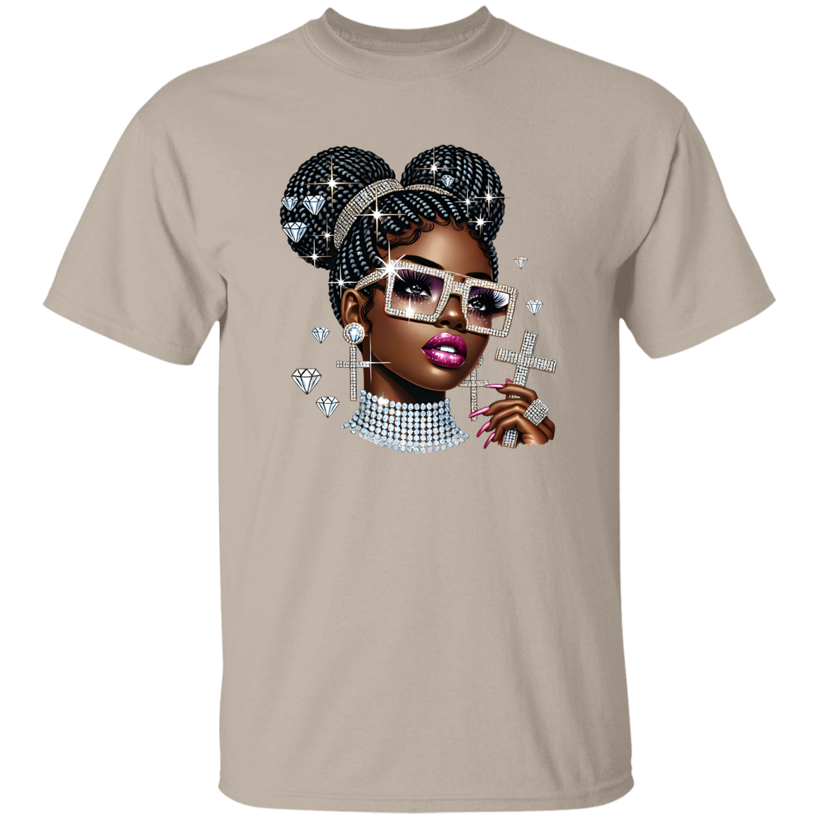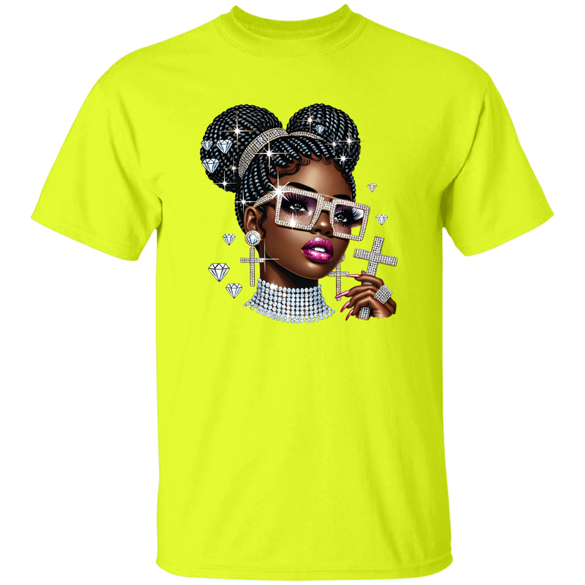 Make a bold statement with the Diamond Diva — Glam Queen T-Shirt . This eye-catching neon yellow shirt showcases a striking illustration of a confident Black woman adorned with braided buns, luxurious jewelry, standout sunglasses, and sparkling crosses. More than just apparel, it embodies a powerful attitude. Perfect for turning heads at events, elevating everyday outfits, or expressing your radiant confidence, this tee is designed for queens who command attention wherever they go.