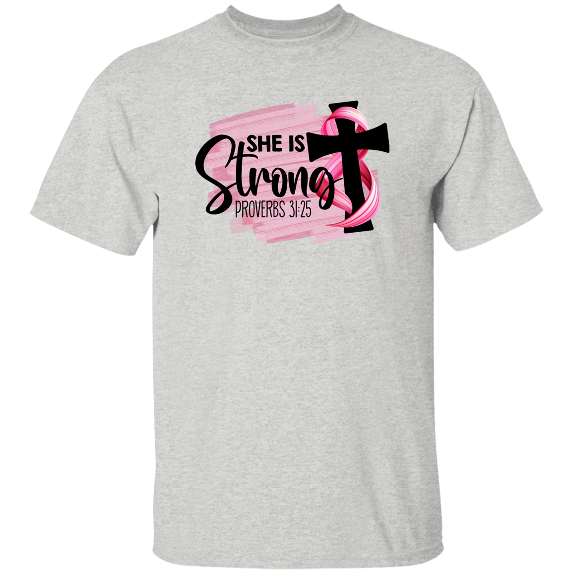 Celebrate strength and resilience with the Breast Cancer "She is Strong" Proverbs 31:25 T-Shirt. Designed to inspire, this shirt features a powerful message of courage and faith, perfect for those supporting breast cancer awareness or honoring survivors. Crafted for comfort and durability, it serves as a meaningful reminder of inner strength and hope.
