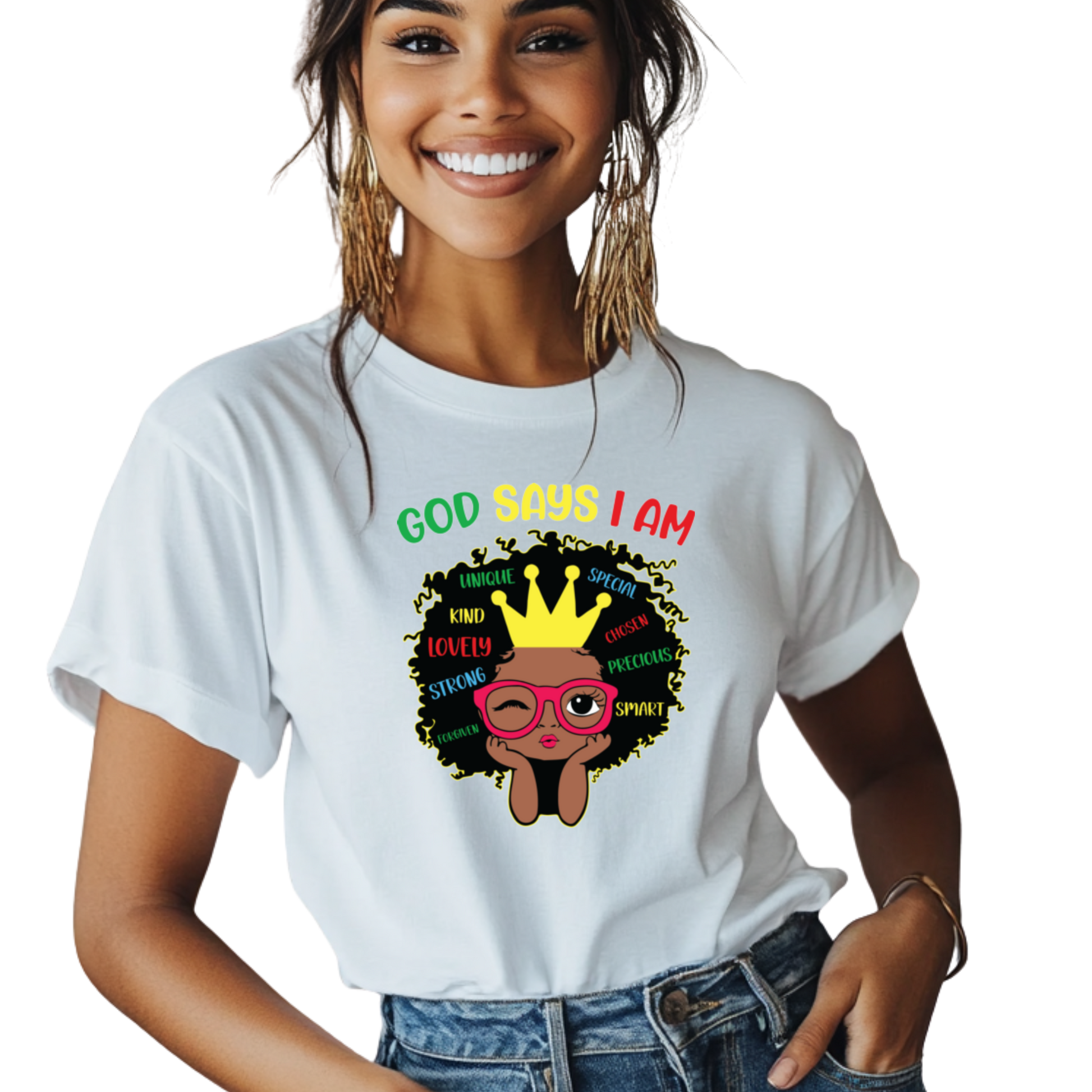 Make a bold statement with the God Says I'Am Unisex T-Shirt, designed for those who embrace faith and confidence. Crafted from soft, durable fabric, this shirt offers all-day comfort and a flattering fit for every body type. Its striking design sparks conversation and inspires positivity, making it perfect for casual wear or meaningful gatherings. Elevate your wardrobe with a tee that speaks your truth and invites connection. This unisex t-shirt features a bold "God Says I'Am" design, offering a confident expression of faith and identity. Crafted for comfort and durability, it suits all genders and provides a versatile wardrobe staple. Ideal for everyday wear, this shirt combines meaningful messaging with a classic fit.