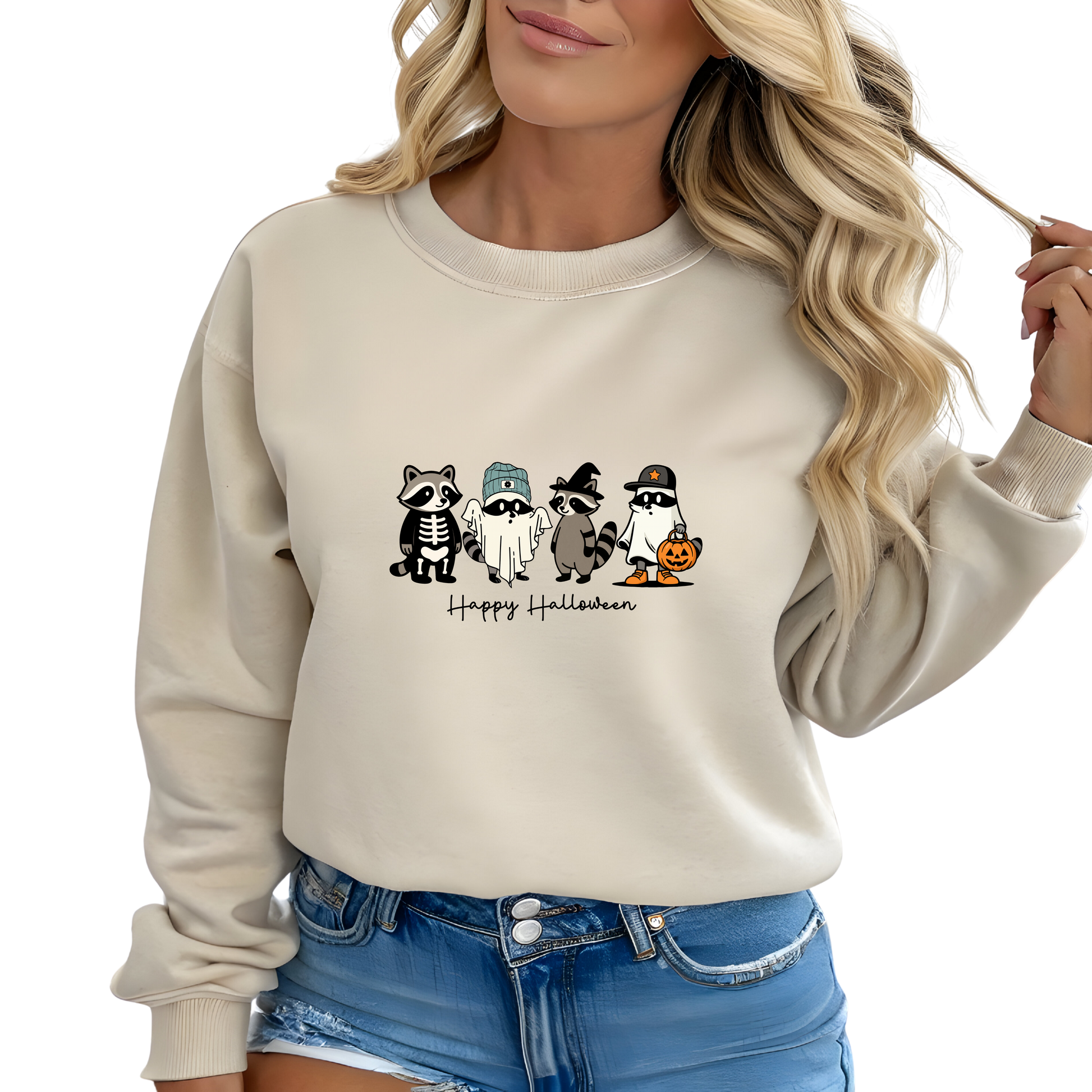 Add the Happy Halloween Raccoon Crewneck Pullover Sweatshirt to your cart and celebrate spooky season in adorable comfort.