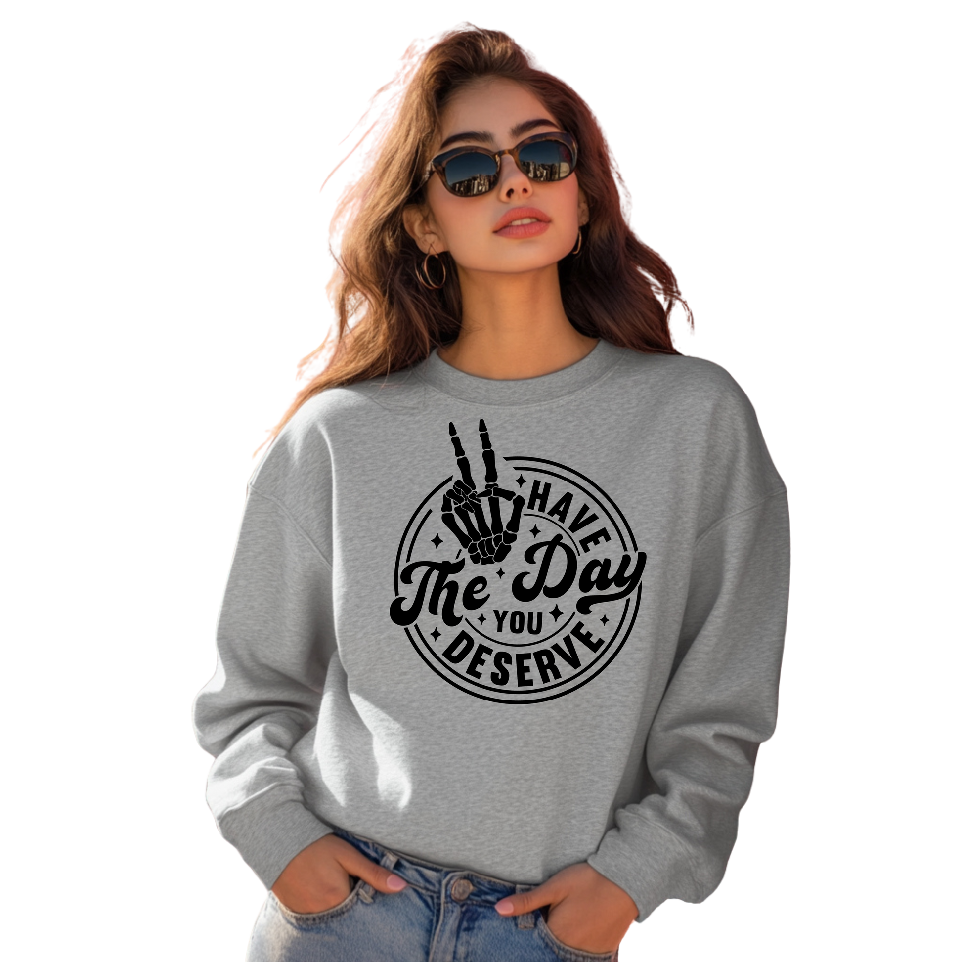 Whether you're sipping coffee or silently serving karma, this Have the Day You Deserve sweatshirt says exactly what you're thinking with a touch of sass and a whole lot of attitude. Featuring a skeleton hand flashing the peace sign, this cozy pullover is perfect for anyone who loves dry humor, unapologetic vibes, and a statement that hits different.