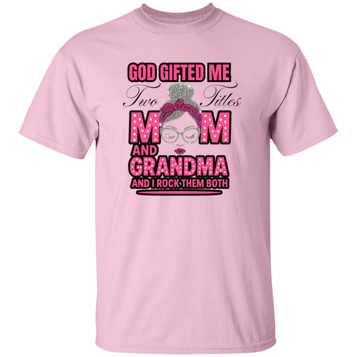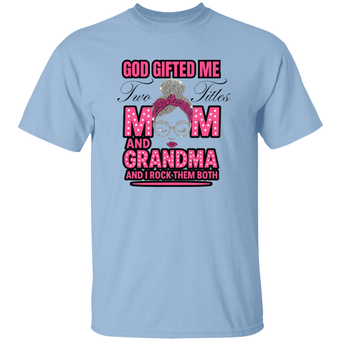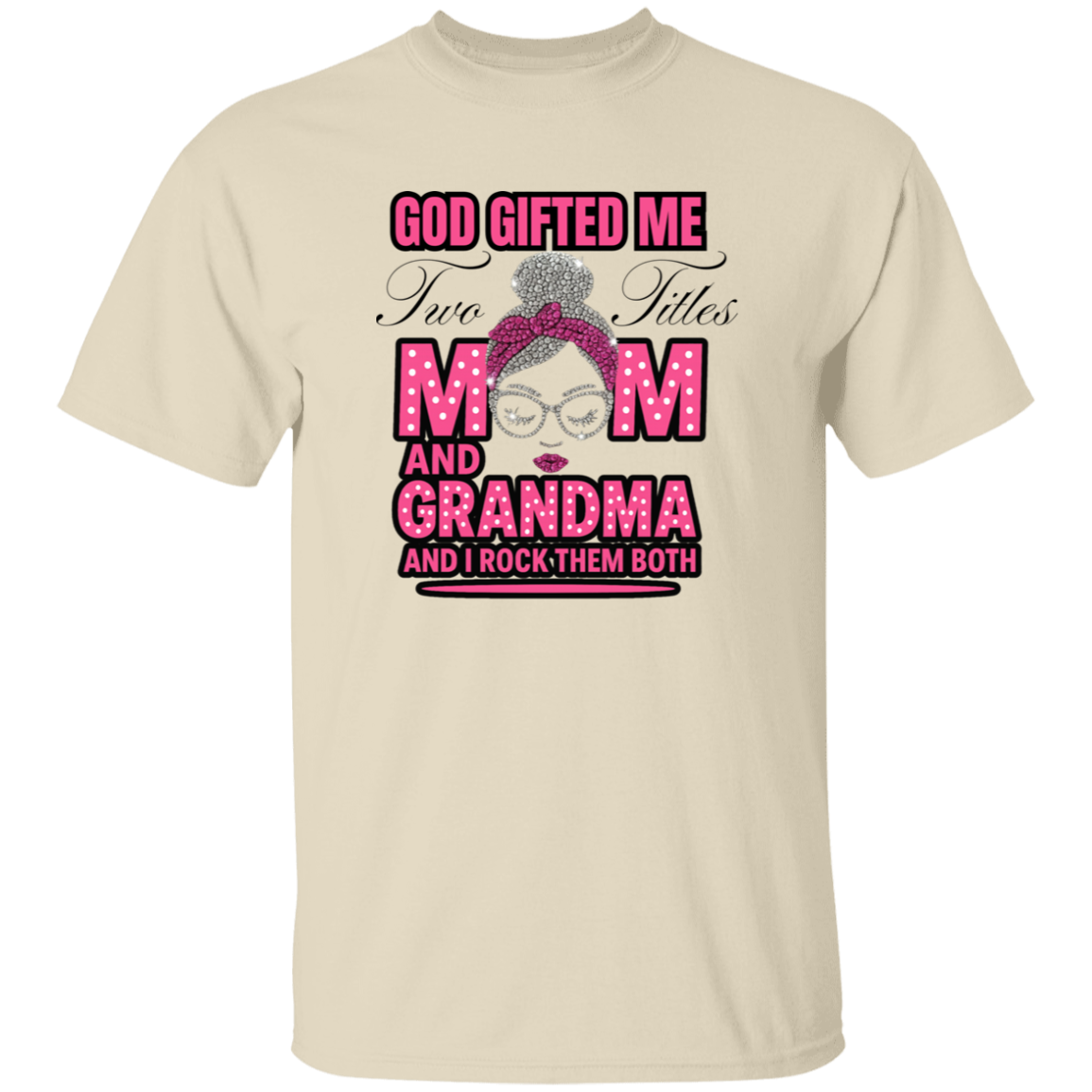 The Two Titles Tee is made for the incredible women who proudly carry the names Mom and Grandma and rock them with unmatched grace and style. Featuring glittery graphics, polka-dot lettering, and a confident mama-grandma illustration, this shirt is as fabulous as the queen who wears it.