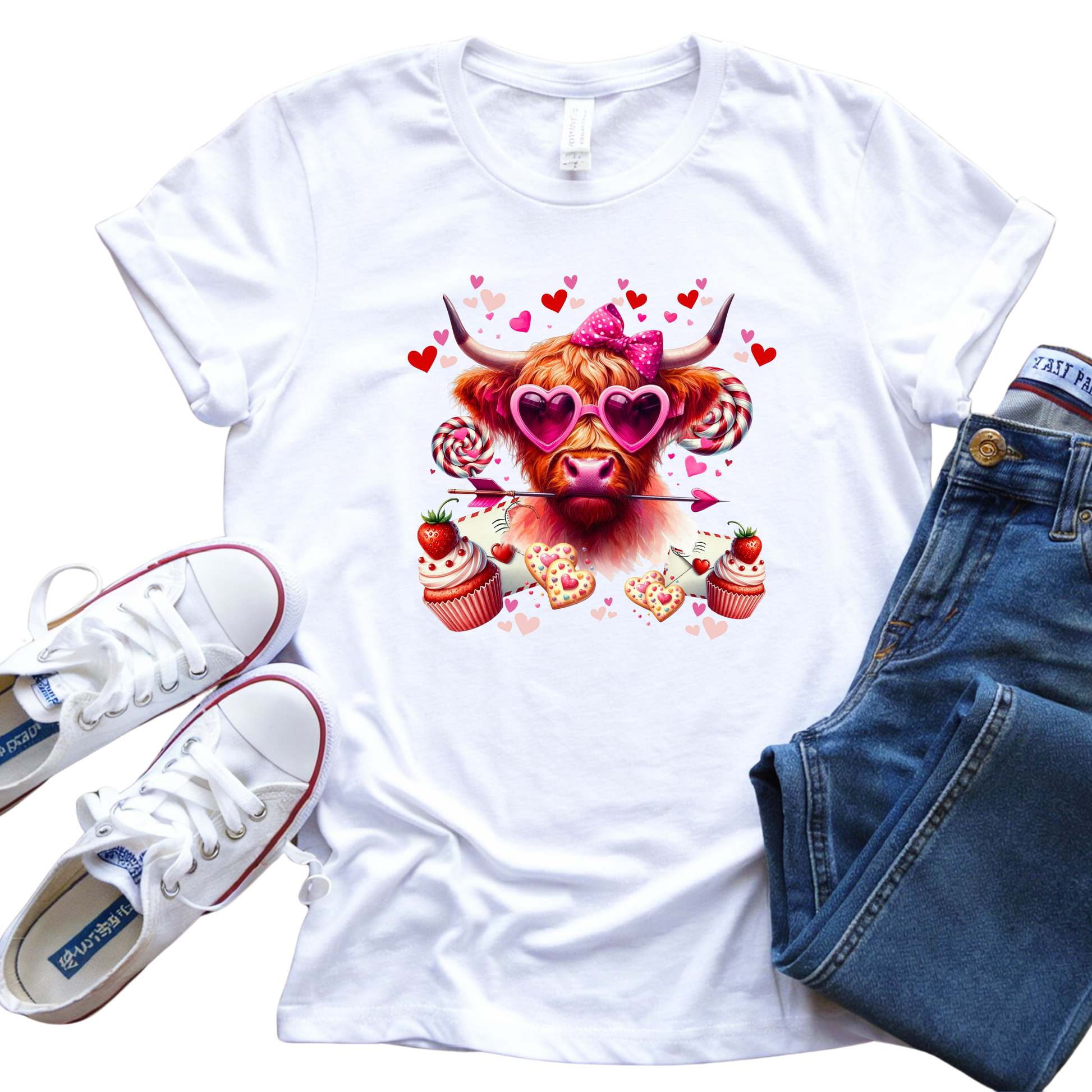 Fall head over hooves in love with the Moo’d for Love Tee! This adorable design features a charming highland cow dressed in heart-shaped sunglasses, candy swirl earrings, and a bow, surrounded by cupcakes, strawberries, and sugary Valentine cheer. It’s the perfect blend of cute. quirky, and cow-some.
