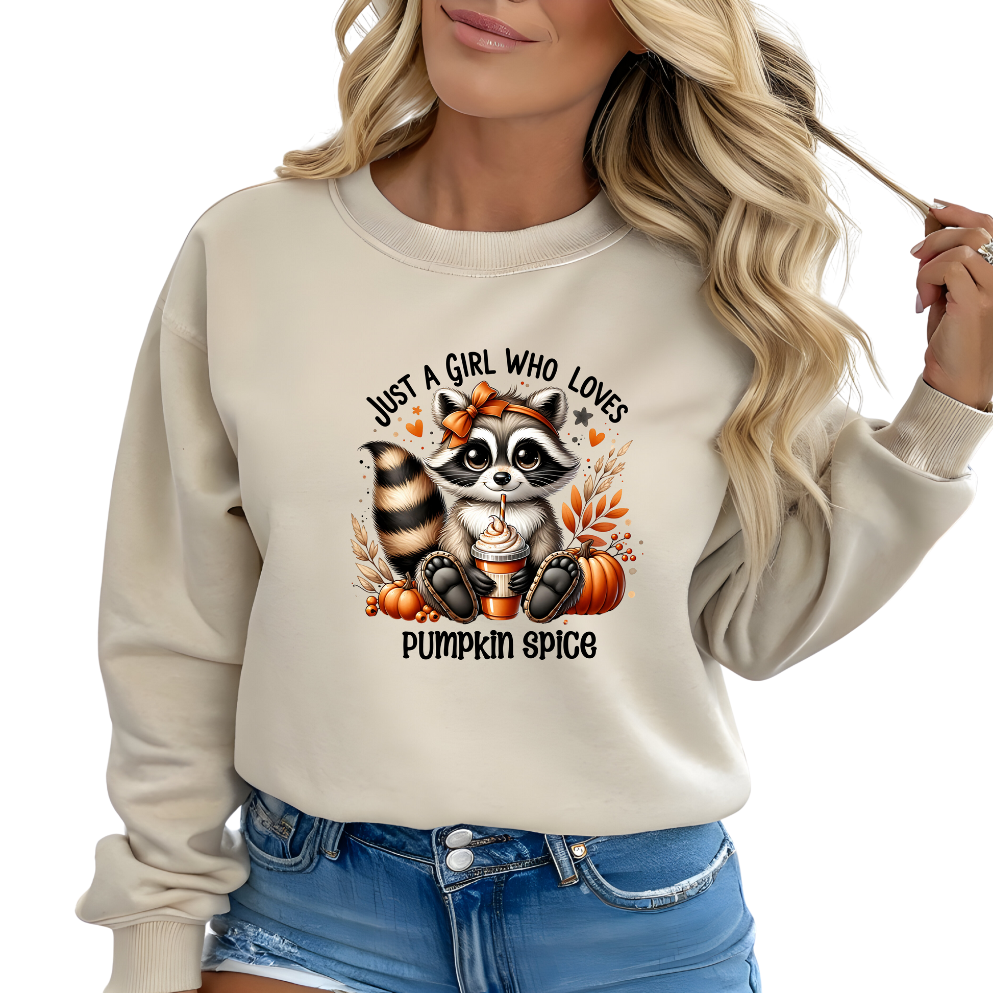 Embrace the cozy vibes of fall with our Just a Girl Who Loves Pumpkin Spice Crewneck Pullover Sweatshirt. Showcasing a charming raccoon enjoying a pumpkin spice latte amid pumpkins and autumn foliage, this soft, warm sweatshirt makes an ideal seasonal wardrobe addition. Whether visiting a pumpkin patch, savoring your favorite latte, or taking a brisk autumn walk, this sweatshirt offers comfort and festive style.