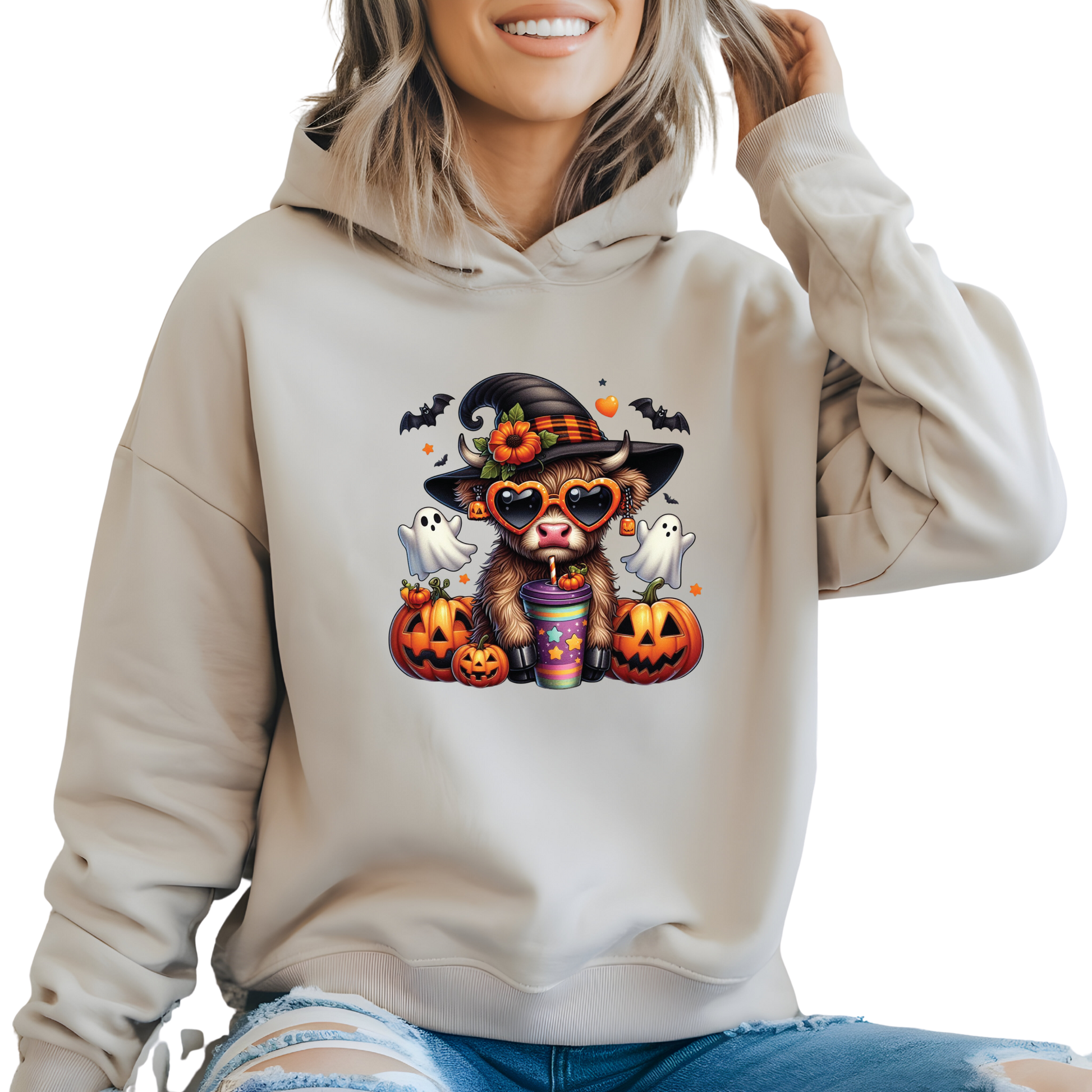This Spooky Moo Vibes Tee is udderly cute with a Halloween twist. Featuring a Highland cow dressed as a sassy witch, surrounded by pumpkins, ghosts, bats, and a festive drink it’s the perfect blend of spooky and sweet.