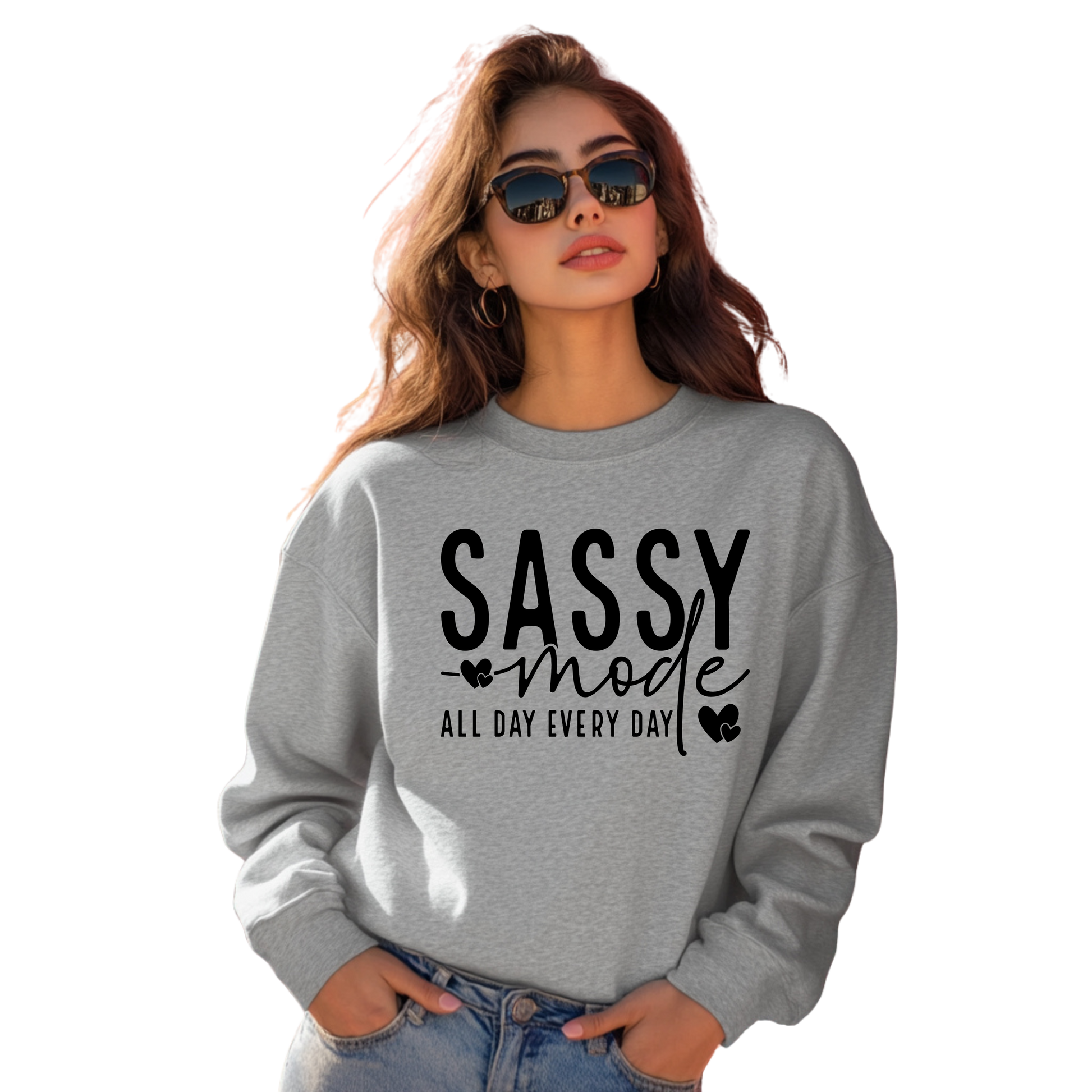 Elevate your casual wardrobe with the Sassy Mode Crewneck Pullover Sweatshirt. Crafted for comfort and style, this sweatshirt features a classic crewneck design and a relaxed fit, making it perfect for layering or wearing on its own. Its soft fabric ensures all-day coziness, while the bold 'Sassy Mode' statement adds a confident edge to your look. Ideal for everyday wear, this pullover combines practicality with a touch of attitude.