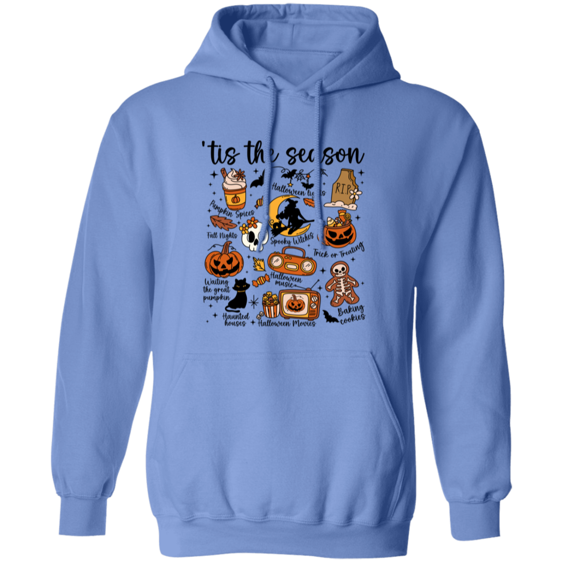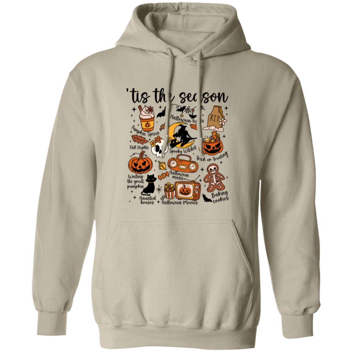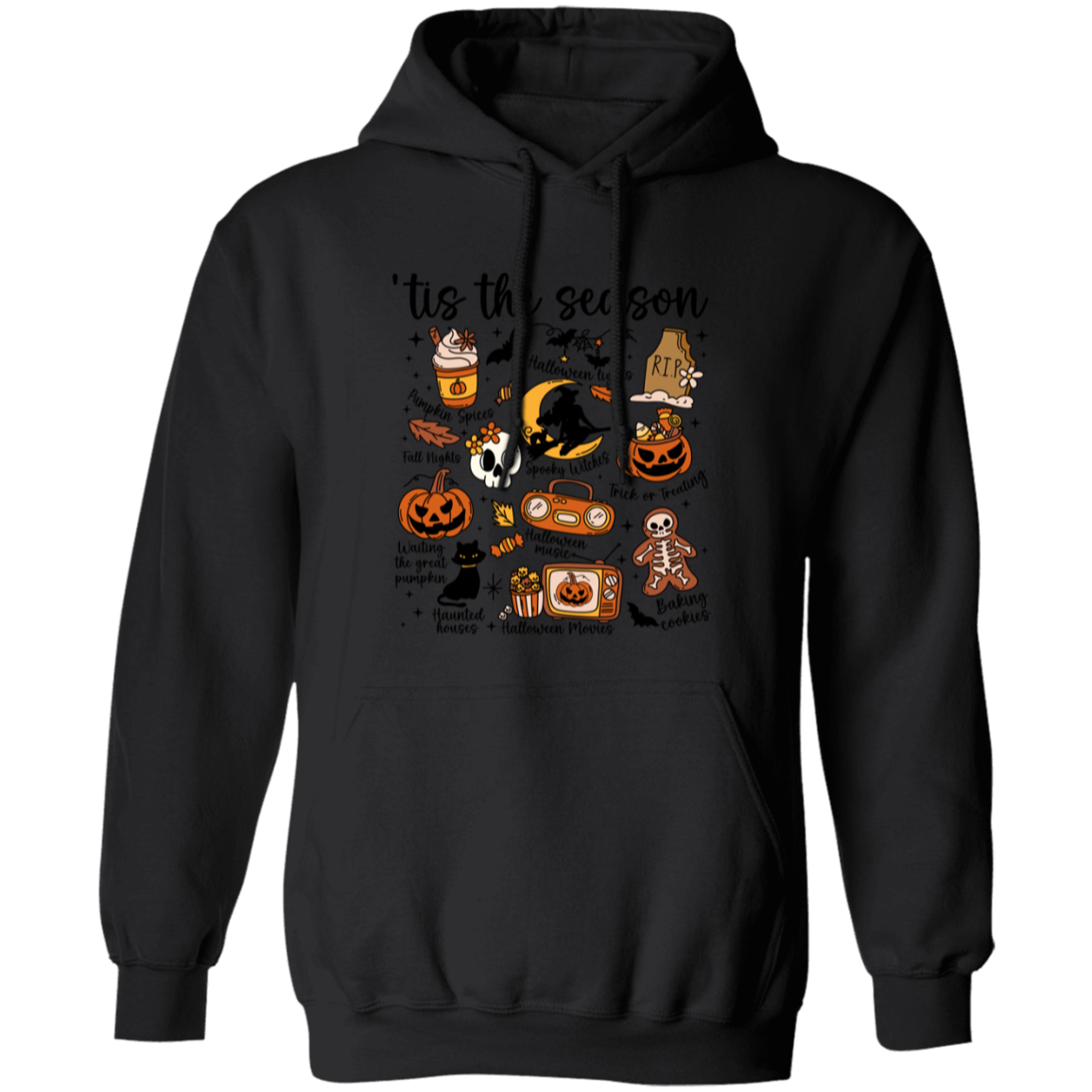 Embrace the autumn season with the 'Tis the Season Halloween Pullover Hoodie, designed as your perfect fall essential. Adorned with charming Halloween motifs such as pumpkins, witches, skeletons, haunted houses, and pumpkin spice lattes, this hoodie embodies the essence of the season. Ideal for pumpkin carving, Halloween movie nights, or exploring haunted attractions, it offers warmth, comfort, and a festive look that keeps you fully immersed in the holiday spirit.