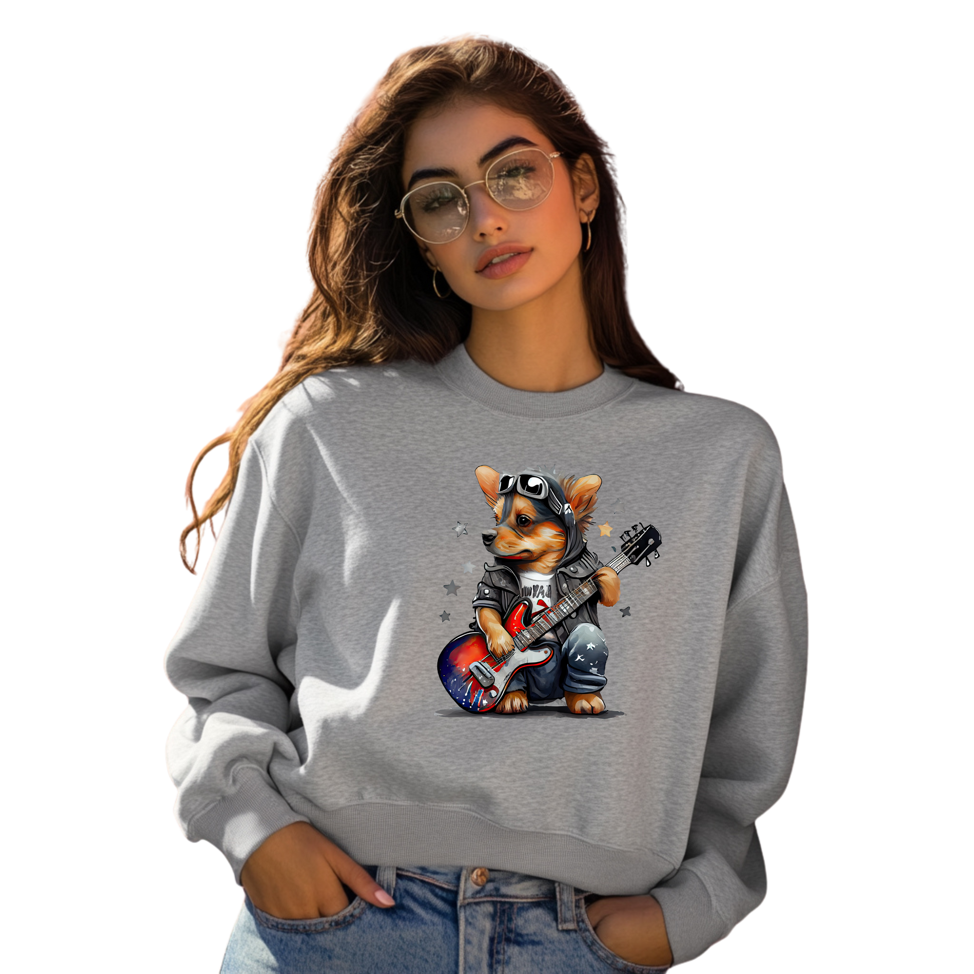 Bring on the attitude and amp up your look with our Rock 'n' Paws Crewneck Pullover Sweatshirt the ultimate blend of comfort, style, and barkstar energy. This design features a fierce little pup rocking aviator goggles, a leather jacket, rolled-up jeans, and a star-spangled electric guitar. With a cool stare and a whole lot of swagger, this dog is ready to headline your wardrobe. Whether you're hitting a concert, chilling with friends, or gifting someone who lives and breathes music, this sweatshirt adds rebellious charm and playful energy to any outfit.